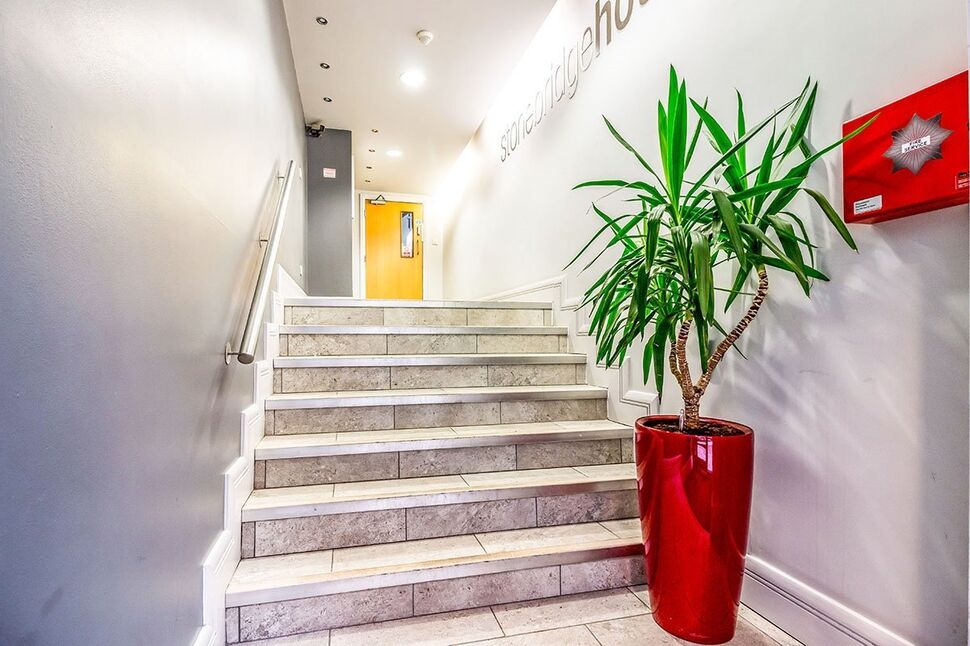 Secure communal entrance at ground level. The apartment can be reached via lift or stairs.