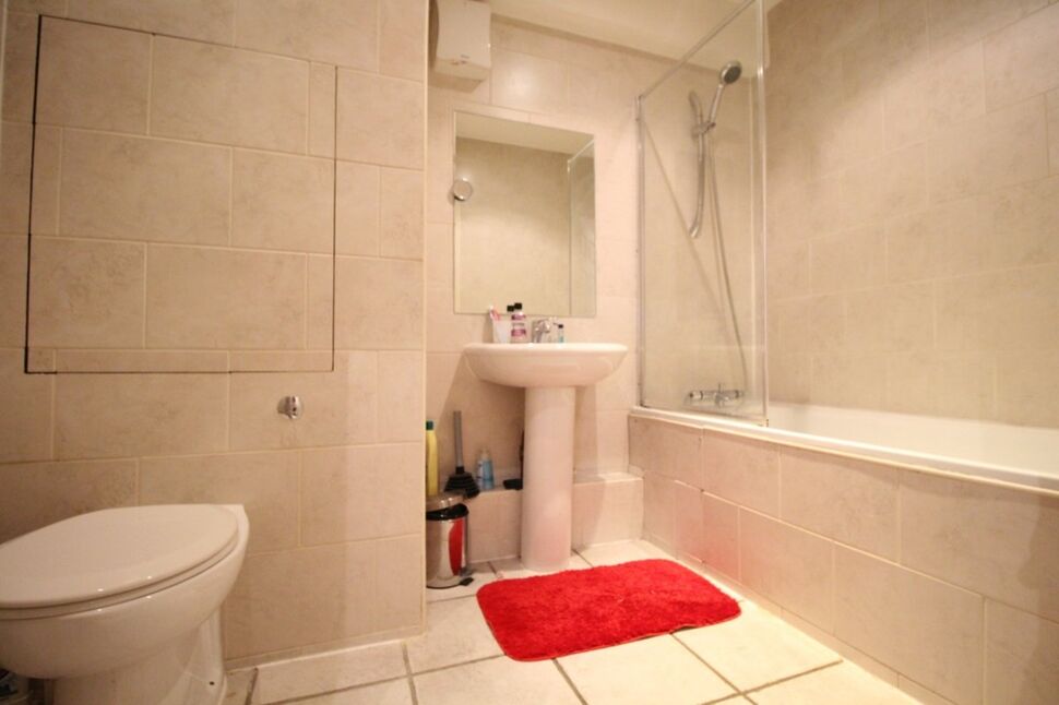 Panelled bath with shower attachment, wash basin with mixer tap, WC, tiled walls and flooring, shaver point, electric heater.