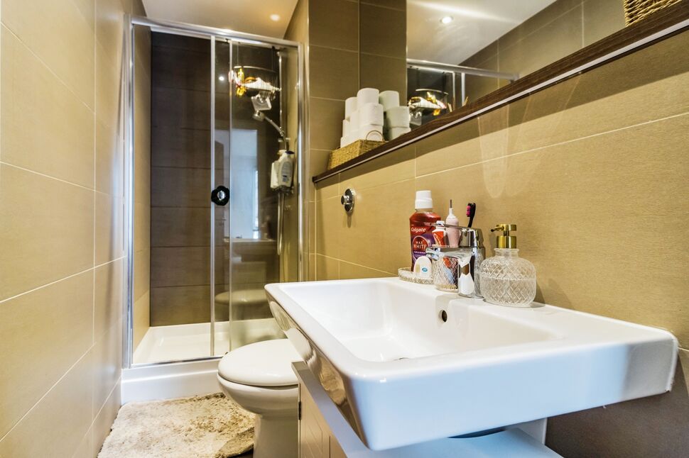 Shower cubicle with sliding door, wash basin with mixer tap, WC, heated towel rail, recessed spotlights.