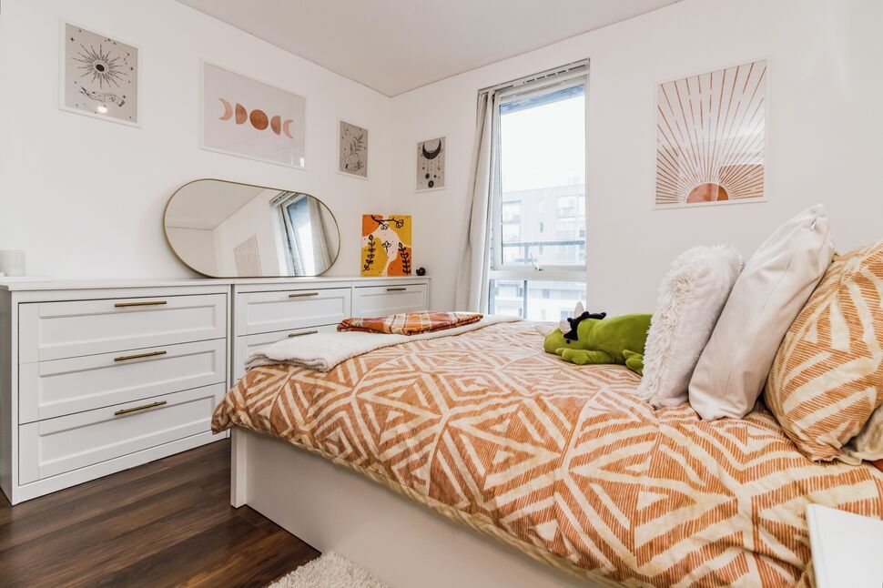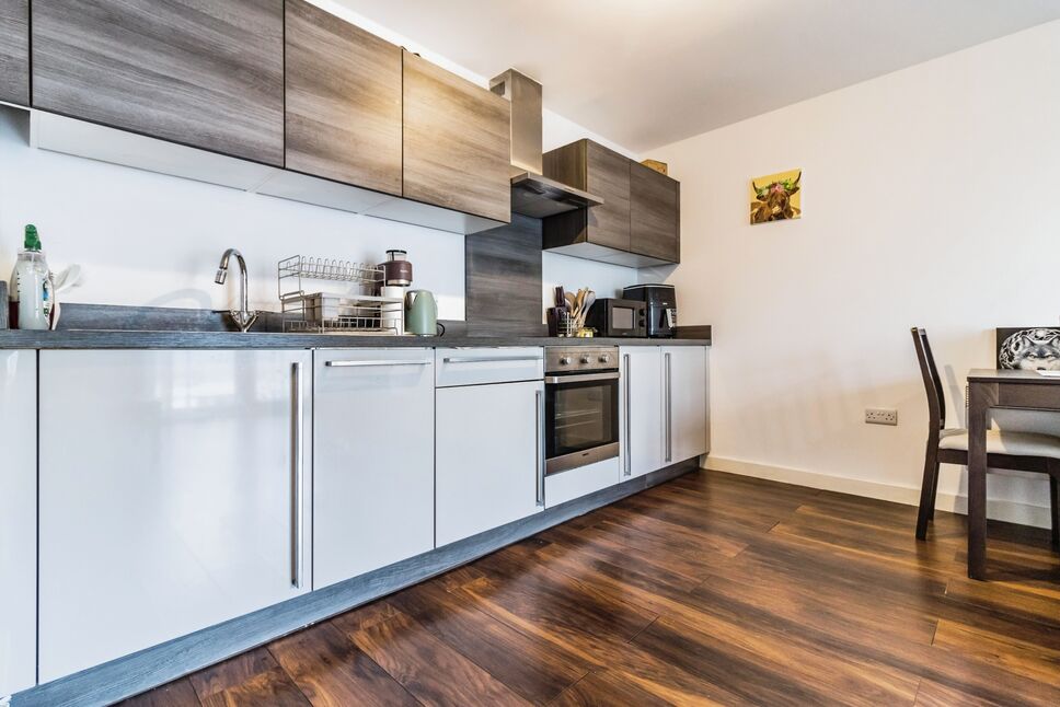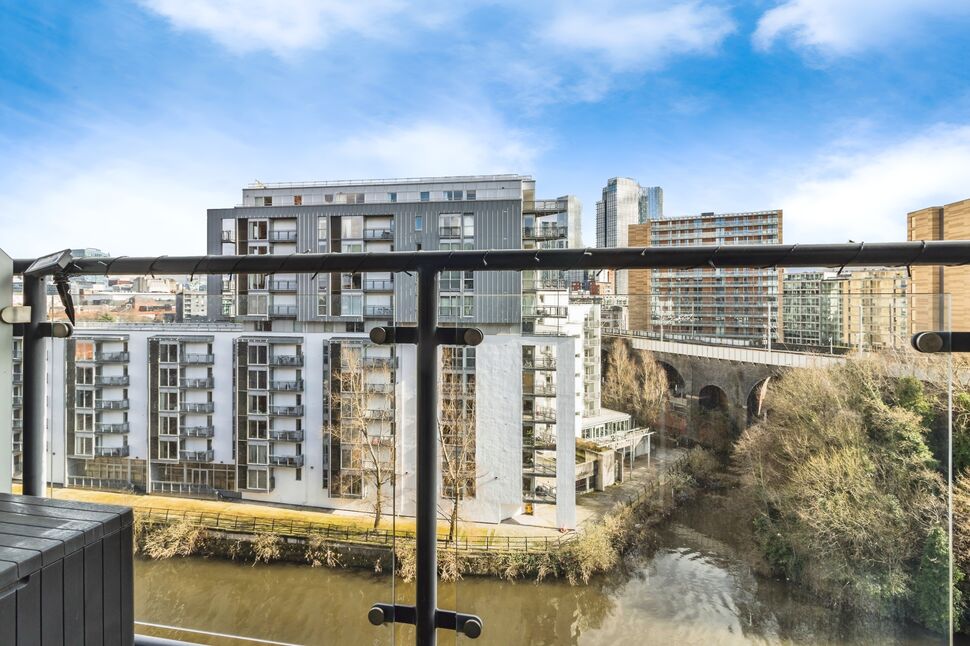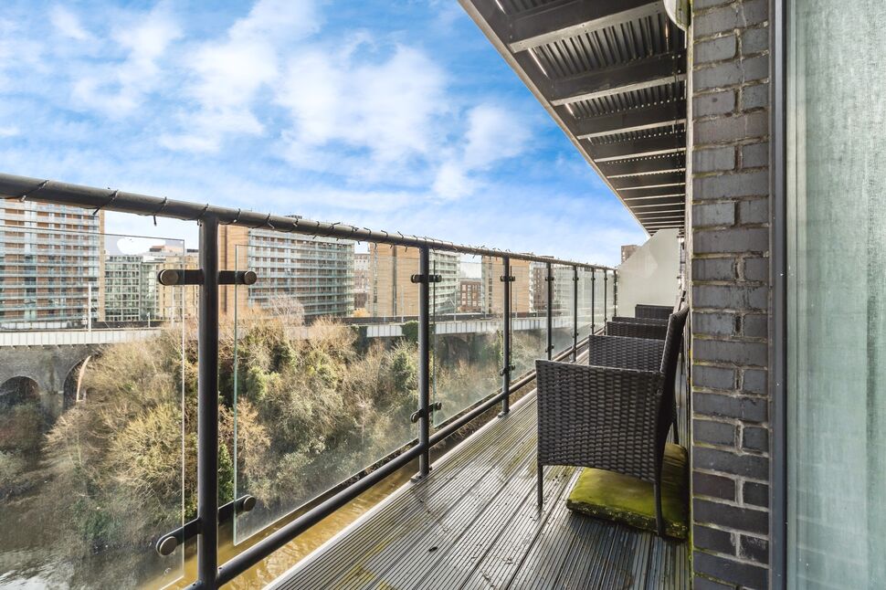 The full-width balcony is a very impressive feature of the apartment, offering a great space for outdoor relaxation with pleasant views over the River Irwell and towards the city centre beyond.