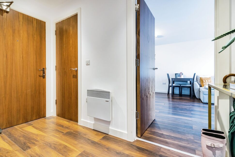 Wooden-style flooring, entry intercom system, electric heater. Utility cupboard housing the water heater with plumbing for a washing machine.