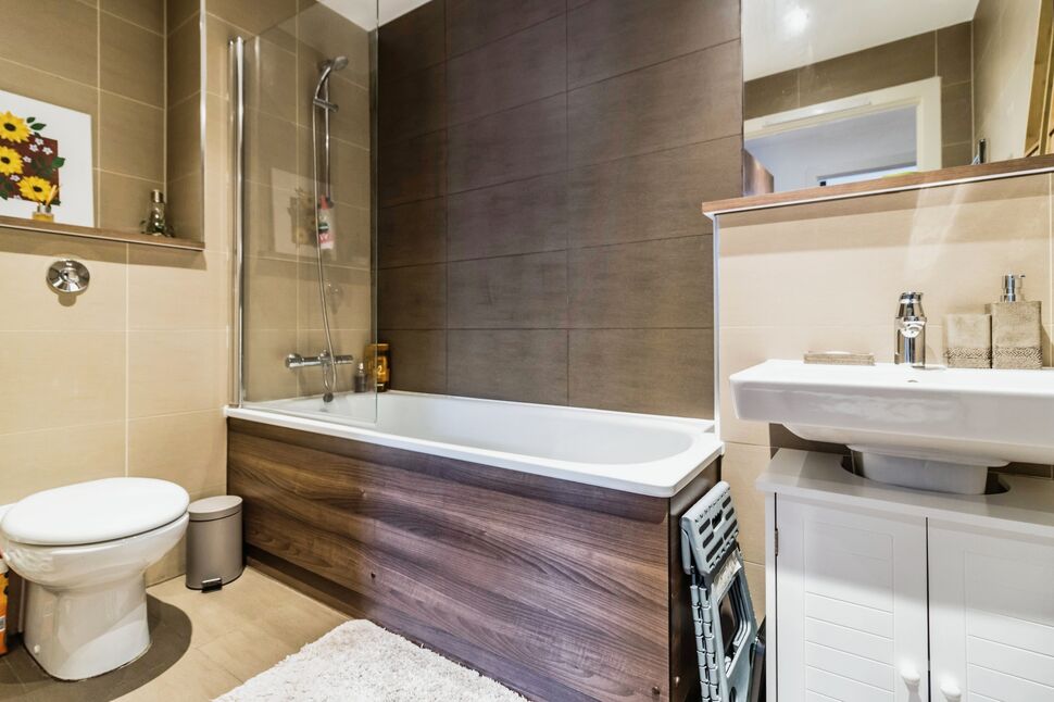 Panelled bath with shower over, wash basin with mixer tap, WC, heated towel rail, recessed spotlights.
