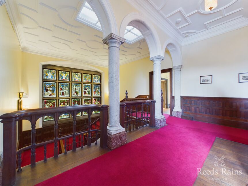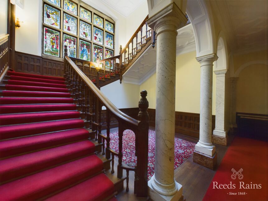 The property is accessed via a communal entrance which features a grand staircase and a breath-taking stained glass leaded light window.