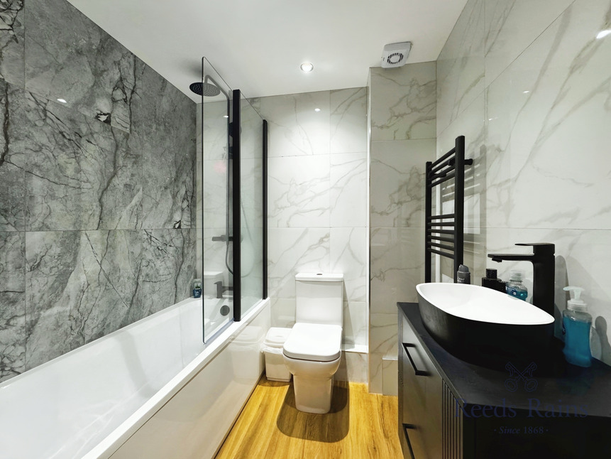 Three piece suite comprising of panelled bath with shower over, part tiled elevations to complement, vanity hand wash basin with feature sink, low level w.c, laminate flooring, extractor fan and heated towel rail.