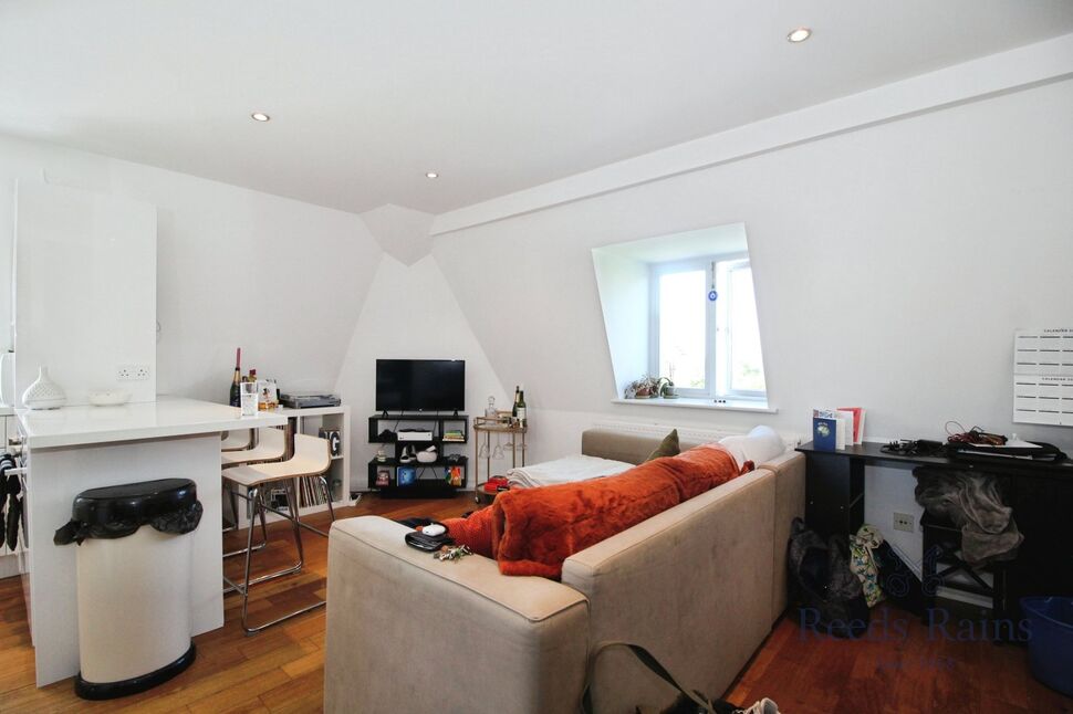 Open-plan living room, with small storage cupboard, open access to kitchen.