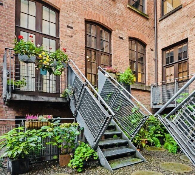 Packed with charm and character, the living area features high ceilings, exposed brickwork and attractive wooden-style flooring. Large windows and a floor-ceiling window and external door provide plenty of natural light and lead out onto a balcony and into a communal courtyard. Stairs leading up to: