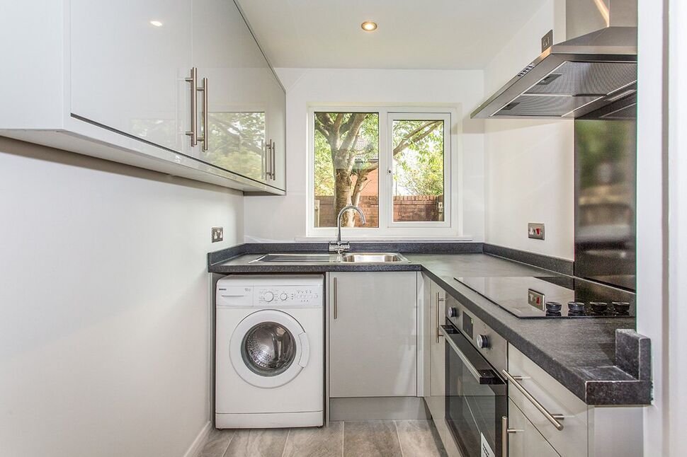 Good range of wall and base units with contrasting work surfaces incorporating single bowl sink and drainer, oven and electric hob with a stainless steel extractor hood over. up-stands and splash backs. Space for appliances. Ceiling light point. Window.