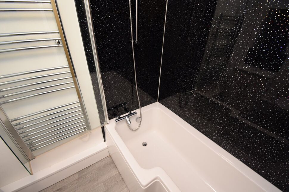 Bath with shower over, w.c., wash hand basin with storage surround.