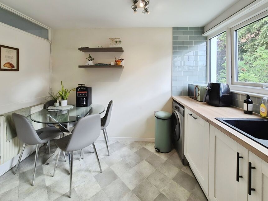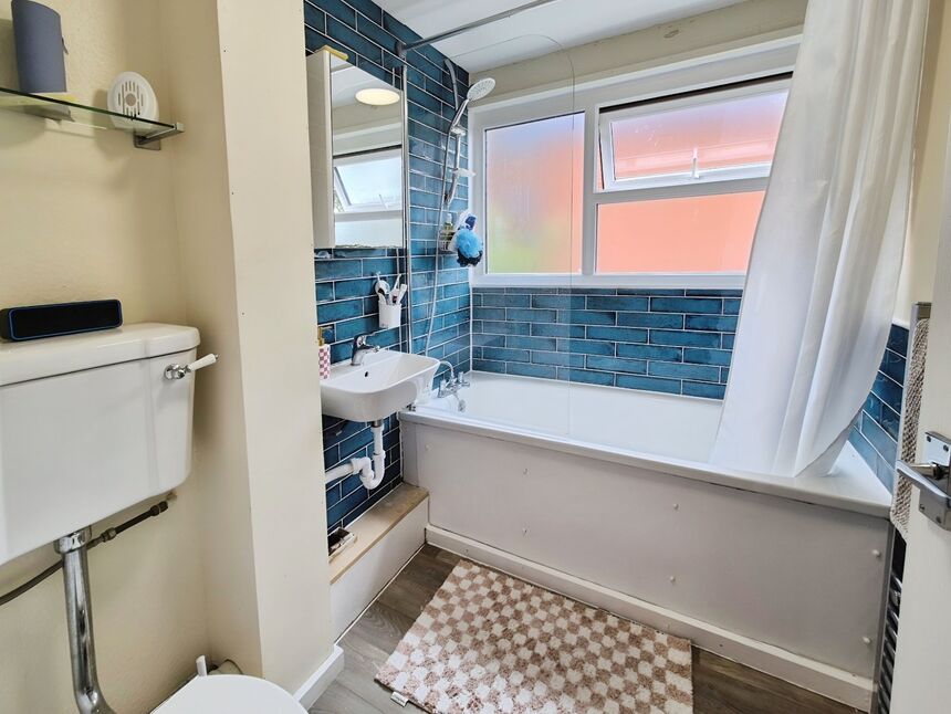 Fitted with a range of modern wall and base units work surface over incorporating sink and drainer Metro tiled splash backs, plumbing for washing machine, cooker point, extractor fan, double glazed window to the rear and radiator.