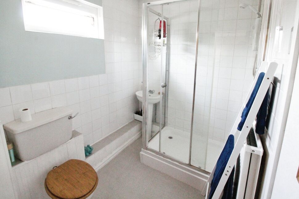 A three piece suite consisting of a walk in shower cubicle with sliding doors, low level WC and wash hand basin, complementary wall tiling, double glazed window to the front elevation, storage cupboard with shelving and cupboard housing gas combi boiler.