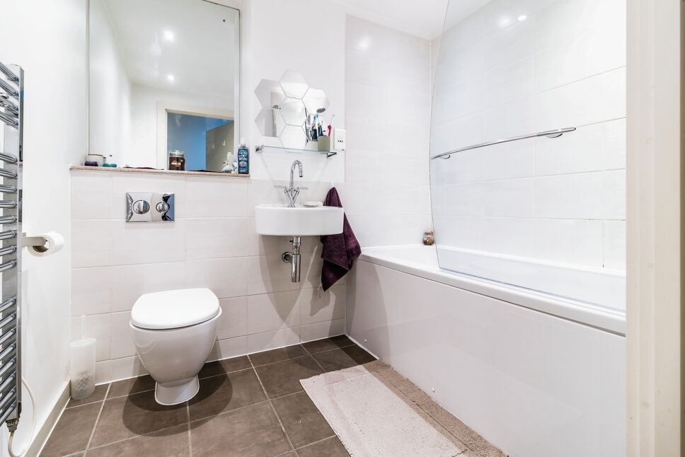 Panelled bath with shower attachment, wash basin with mixer tap, WC, shaver point, tiled splashbacks and flooring, heated towel rail.