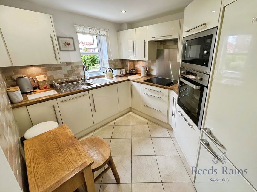 The heart of the home is the well-lit kitchen, offering a natural light source, an integrated fridge freezer, a dishwasher, and a combination of base and eye-level units providing ample storage and workspace.