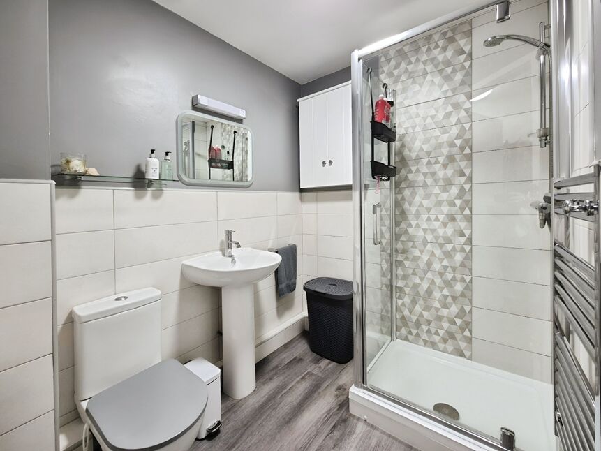 White suite comprising of shower cubicle, pedestal wash hand basin, low level w.c, part tiled walls, electric wall heater, extractor fan and Kardean flooring.
