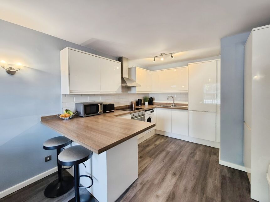 With double glazed window to the front, electric wall heater, kardean flooring, kitchen area is fitted with a range of wall and base units with work surface over incorporating stainless steel sink and drainer, Metro tiled splash backs, integrated electric hob, electric oven, extractor hood, integrated fridge/freezer integrated dishwasher and breakfast bar.