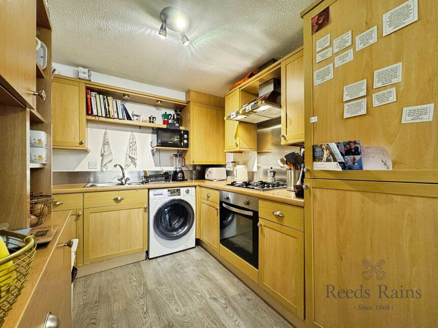 A range of eye/base units with contrasting work surface, integrated fridge freezer, gas hob, electric oven and space for washing machine, extractor over, stainless steel sink drainer unit, radiator and ceiling light point.