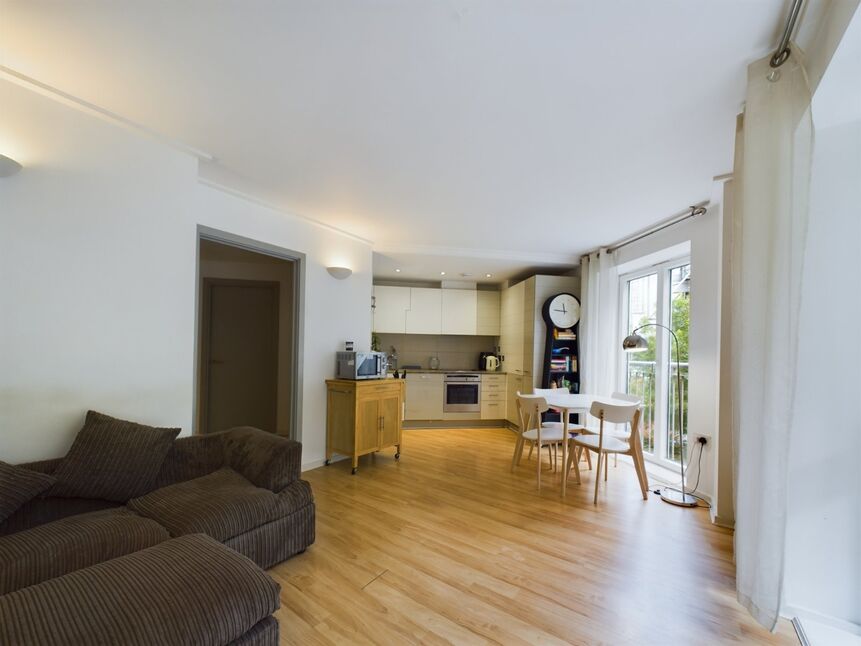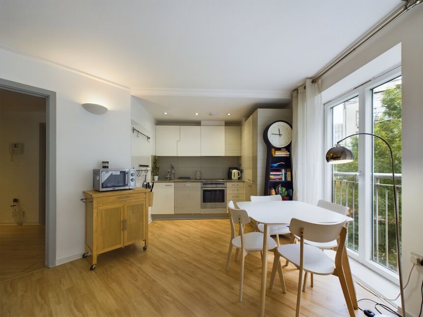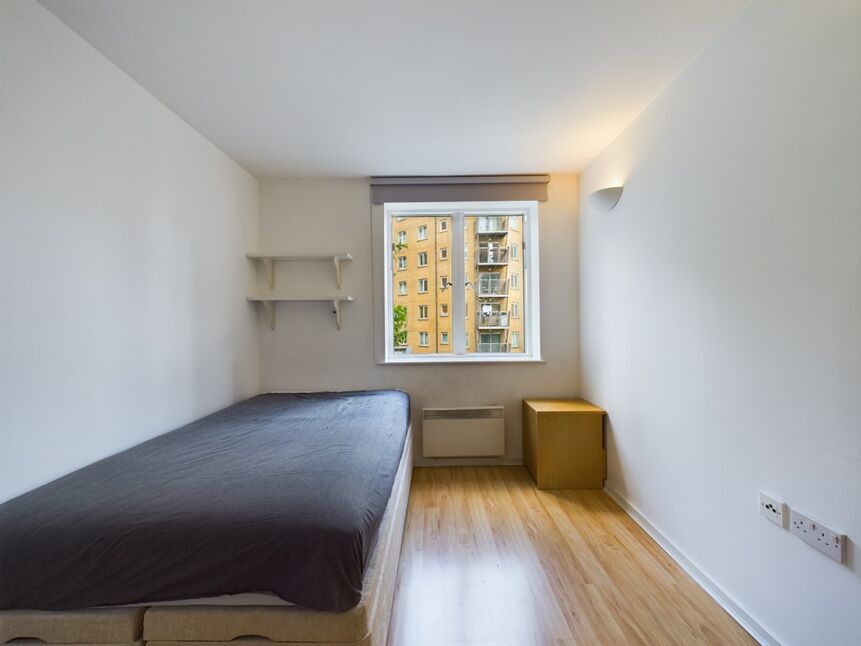 This modern two bedroom flat is located in a gated development near Canary Wharf, adjacent to the Thames. The property features a spacious reception room with an elegant wood floor and a sleek, integrated open-plan kitchen. It includes two double bedrooms, a bathroom and a balcony. The complex boasts amenities such as a steam room, sauna, jacuzzi, communal garden, and a 24-hour concierge service.