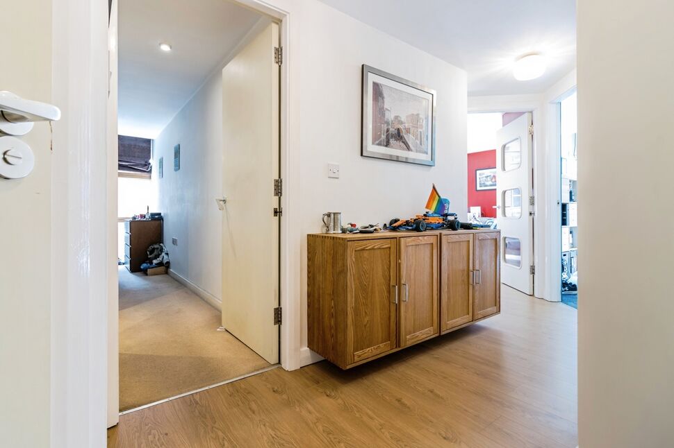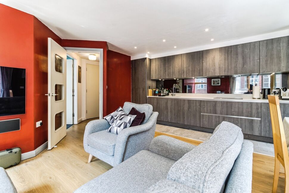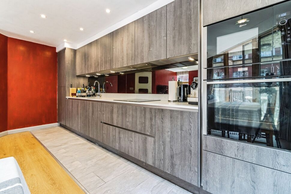 The spacious dual aspect living area takes advantage of the apartment's corner position, with three large floor-to-ceiling windows providing great natural light and access to the balcony. The main living and dining area has flooring in the same style as the hall, seamlessly linking the spaces. The current owners have installed a high-specification contemporary kitchen offering a wide range of fitted units with contrasting worktop and feature lighting, integral electric oven, inset sink with mixer tap, integral hob with extractor hood, contrasting flooring, integral fridge/freezer and dishwasher, recessed spotlights. Sliding door onto: