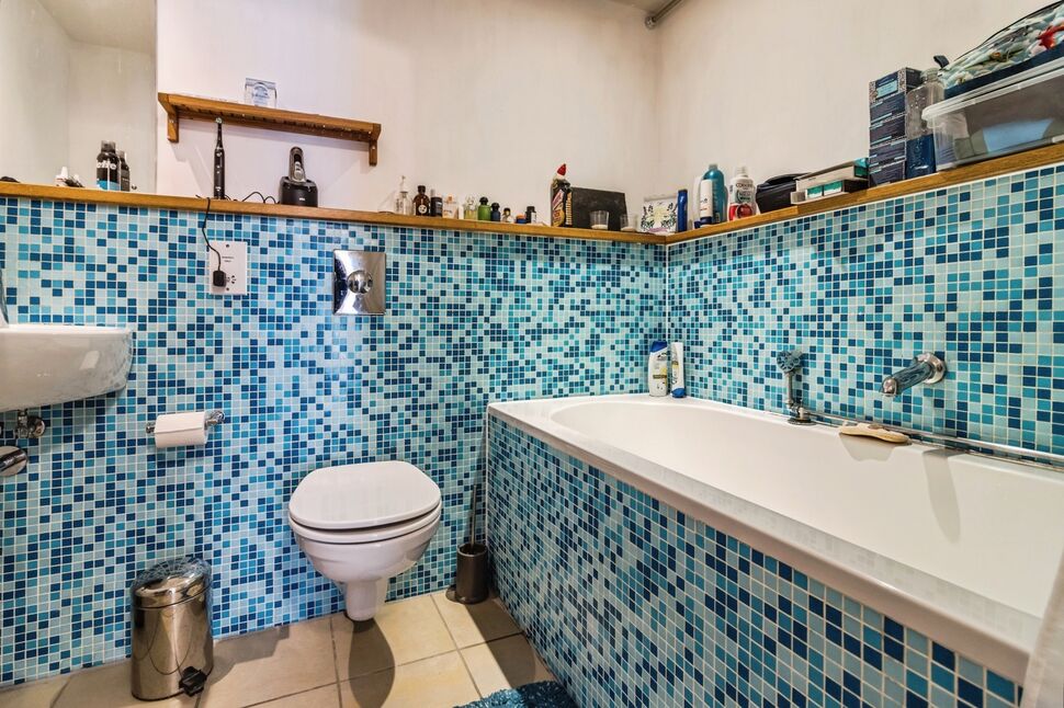 Panelled bath with shower attachment, wash basin with mixer tap, WC, tiled splashbacks and flooring, heated towel rail.