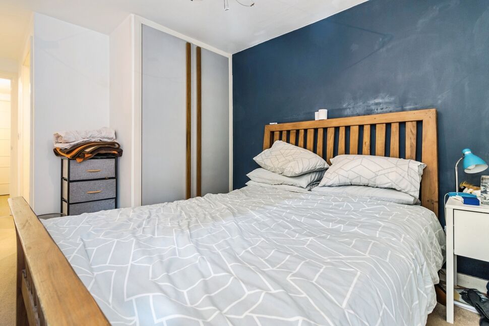 With floor-to-ceiling window, carpeted floor and fitted wardrobe. Door to: