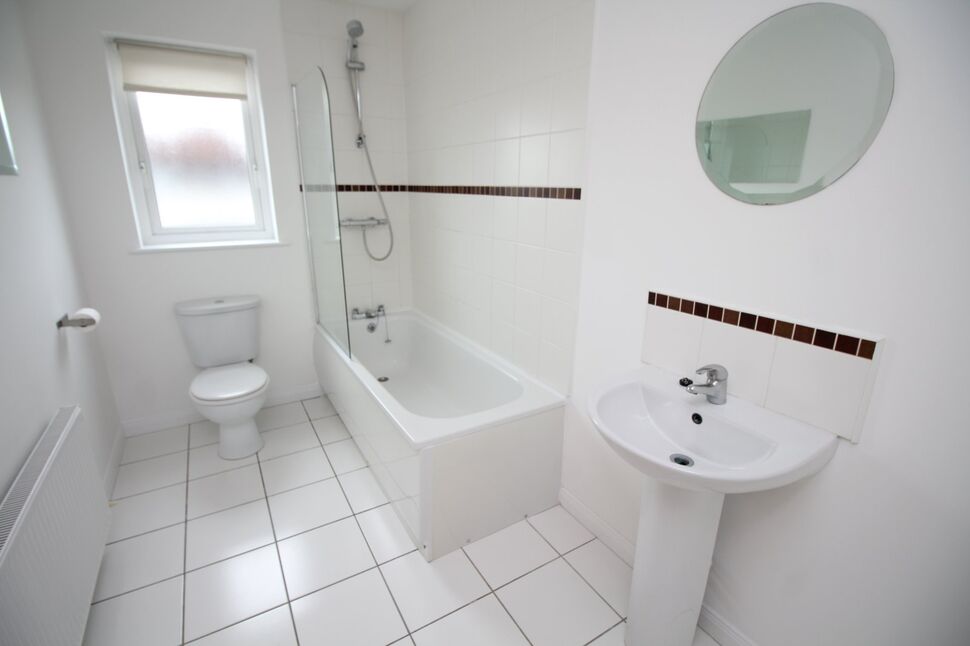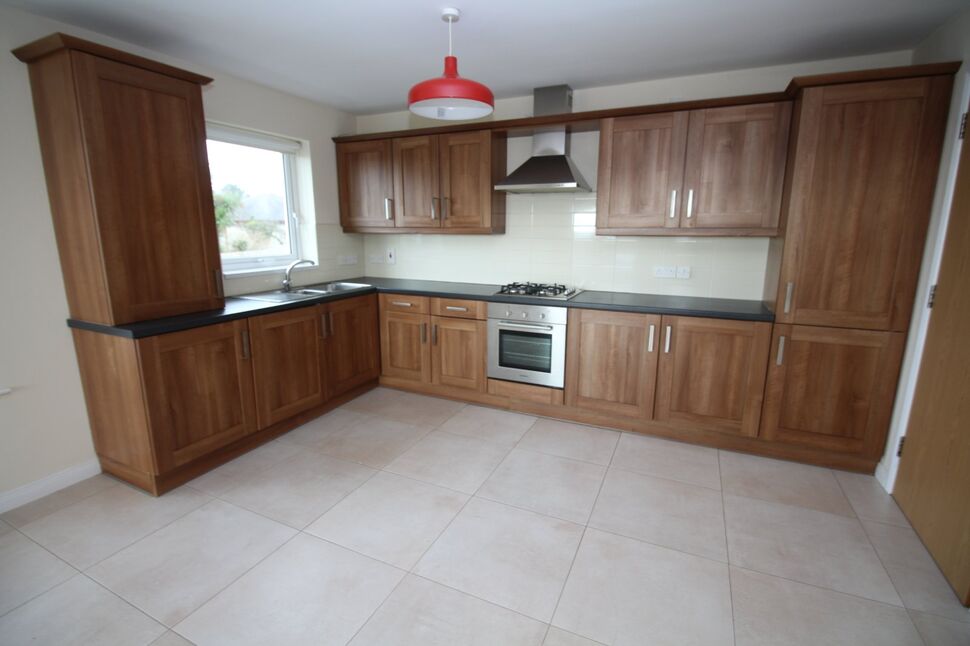 Modern range of fitted high and low level units. One and a half bowl stainless steel sink unit with mixer tap. Built in hob and oven. Extractor fan. Integrated fridge/freezer and washer/dryer. Tiled floor and part tiled walls. Gas boiler. PVC double glazed French doors to mock balcony.