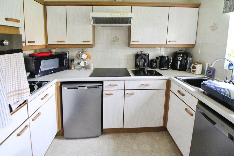 Fitted with a range of base and wall units with work surface over and inset sink unit with drainer, integrated appliances consist of electric oven with four ring hob and extractor hood over, under counter fridge and freezer, double glazed window to the side elevation and complementary wall tiling.