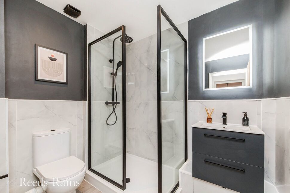 Stunning stylish fitted shower room/ WC with white suite comprising of a WC, wash basin (with drawer below and touch sensor mirror fitted above), and walk in shower enclosure with shower over and additional hand held shower head. Heated towel rail. Part tiled walls. Inset down lighting. Extractor. LVT flooring.