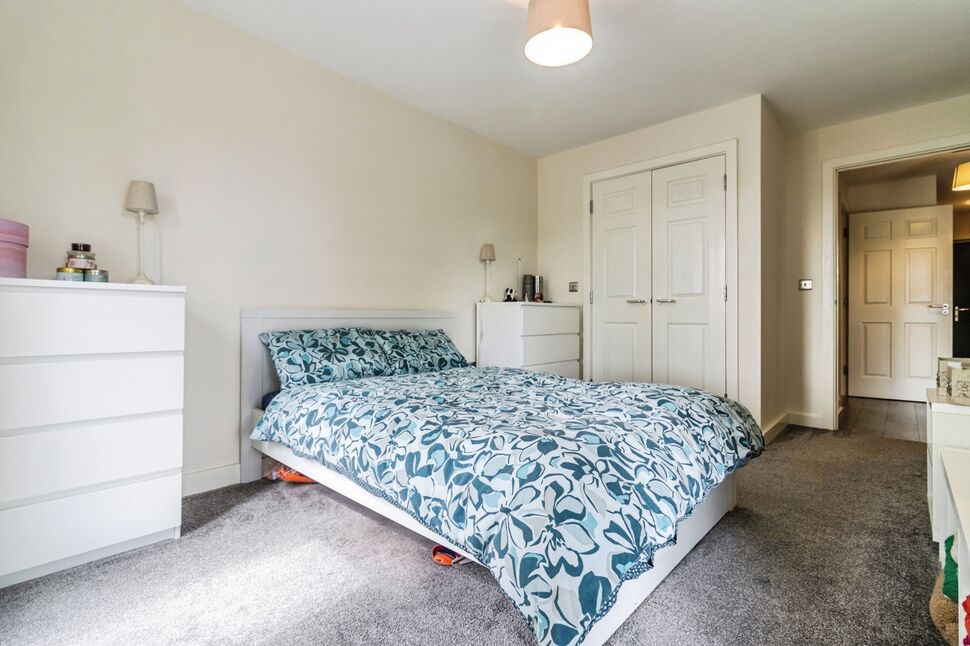 A spacious main bedroom also enjoying access to the balcony via a glazed door with a further full-height window providing extra natural light. Fitted wardrobe providing excellent storage, carpeted floor, electric heater.