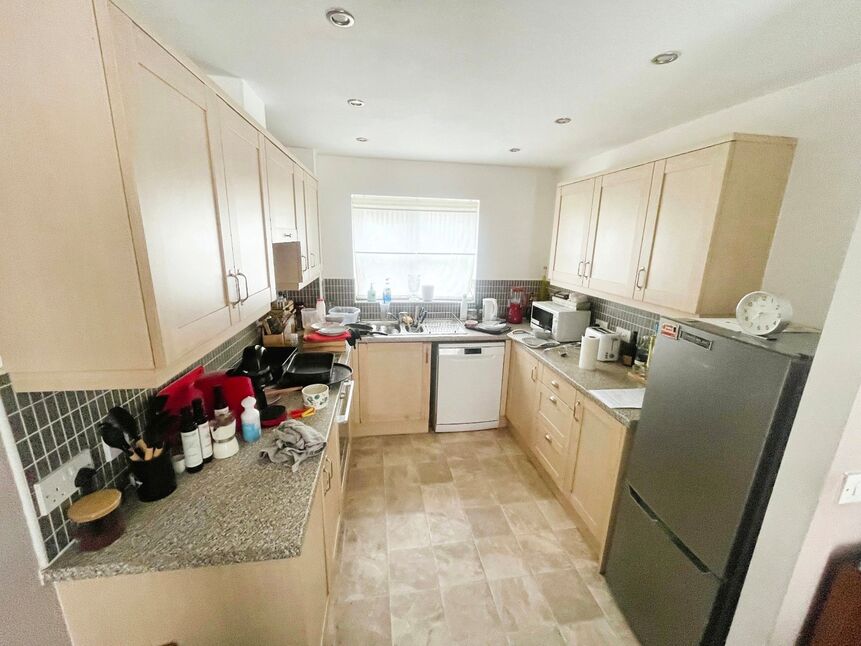 The kitchen is fitted with a selection of modern Beech effect base and wall units with a working area incorporating a stainless steel sink and drainer with mixer taps above. Including an integrated oven, 4 ring hob and extractor over and providing pluming for an automatic washing machine. Fitted with spotlights recessed to the ceiling and a uPVC double glazed window.