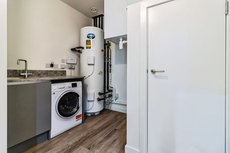 Sink unit with mixer tap and cupboard below along with plumbing for a washing machine, water heater, understairs storage cupboard.