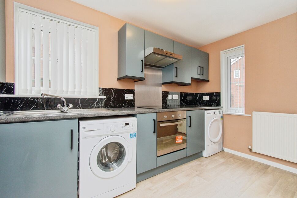 Fitted with a range of wall and base units, a roll edge work surface with a stainless steel sink and chrome effect mixer tap inset. A stainless steel electric oven, electric hob with stainless steel cooker hood over, a storage cupboard, plumbing for a washing machine, space for a dryer, a central heating radiator and windows overlook the side and front aspects.