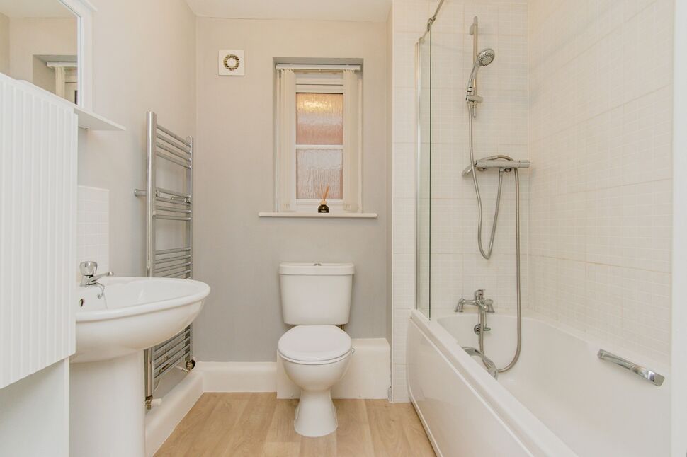 Comprises of a low level WC, a pedestal wash basin and a panelled bath with a chrome effect mixer tap inset and a chrome effect mains shower over. With tiles to splash back areas, a central heating radiator and a window overlooks the side aspect.