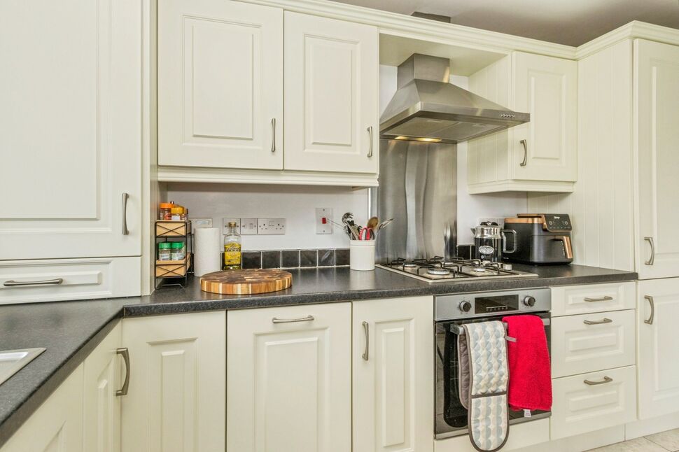 Luxury fitted range of high and low level units, laminate work tops, integrated appliances, open to living. dining area, views over communal green area.