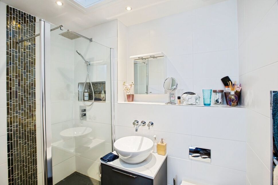 A lovely three piece shower room with walk in shower and thermostatic valves. Also comprising of low level wc and sink unit. Fully tiled floor and walls with light tunnel and radiator.