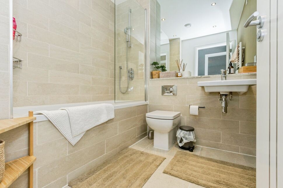 The beautiful bathroom has a three piece suite to include a mounted wash hand basin with mixer tap, a low flush wc, concealed cistern, and bath with an overhead shower unit. The bathroom has been fully tiled and also has a heated towel rail.