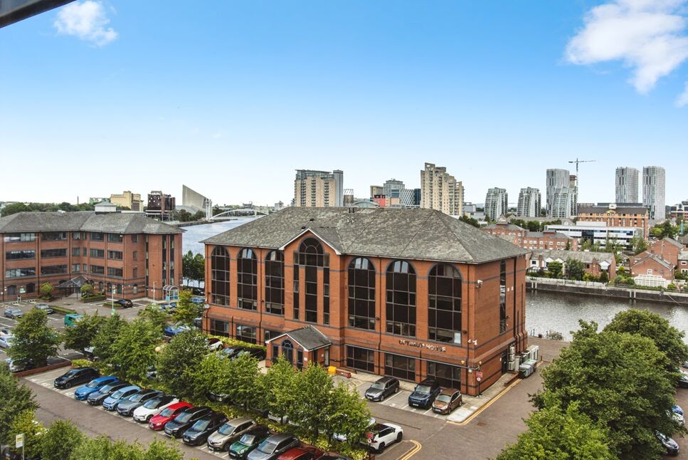 A spacious and versatile living area having plenty of room for lounge and dining furniture with stylish wooden-style flooring and a Juliet-style balcony offering pleasant water views towards MediaCity beyond. Kitchen area with fitted base and wall units, integral electric oven and hob with extractor above, sink with mixer tap, integral fridge/freezer and dishwasher.Cupboard with water heater and plumbing for a washing machine.