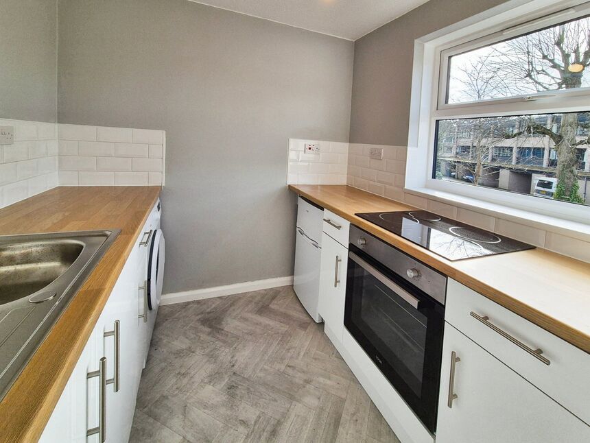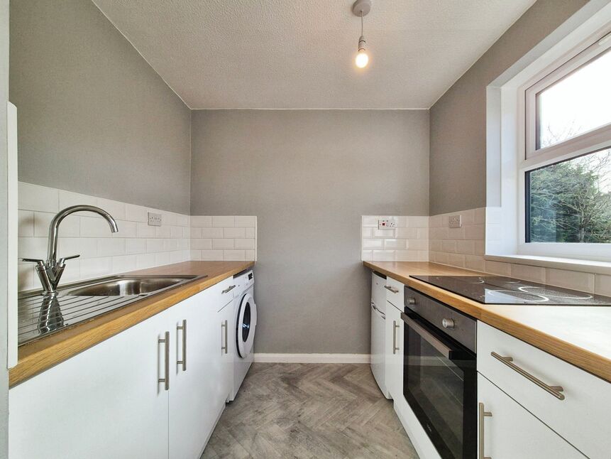 Double glazed window to the front. Fitted with a range of matching drawer and base units with work surfaces over and tiled splash backs, integrated oven and hob, plumbed in washing machine, and fridge freezer which are both included. integrated bowl sink unit. with mixer tap.