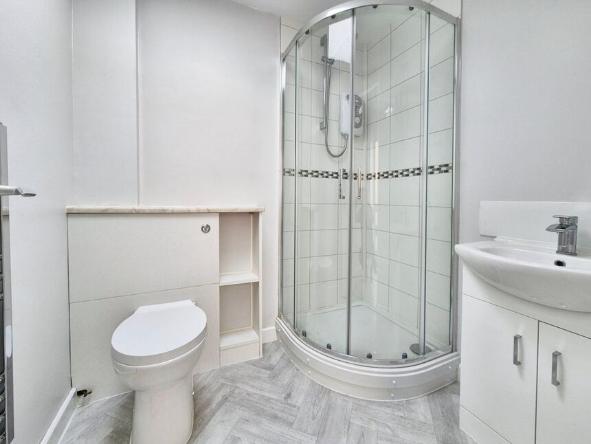 Fitted with a modern white three piece suite comprising low level WC, wash hand basin mixer tap and a walk in shower cubicle. Fully tiled walls. Heated towel rail.