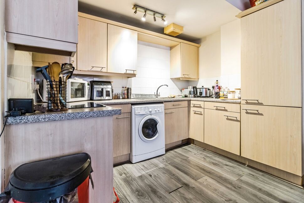 An exceptionally spacious open-plan layout with ample scope for distinct lounge and dining areas, with large windows across the rear elevation providing plenty of natural light. Wooden-style flooring and electric heating. Kitchen area with fitted base and wall units, integral electric oven and hob with extractor hood, 1.5 bowl sink with mixer tap, tiled splashbacks, integral fridge/freezer, space for a washing machine.