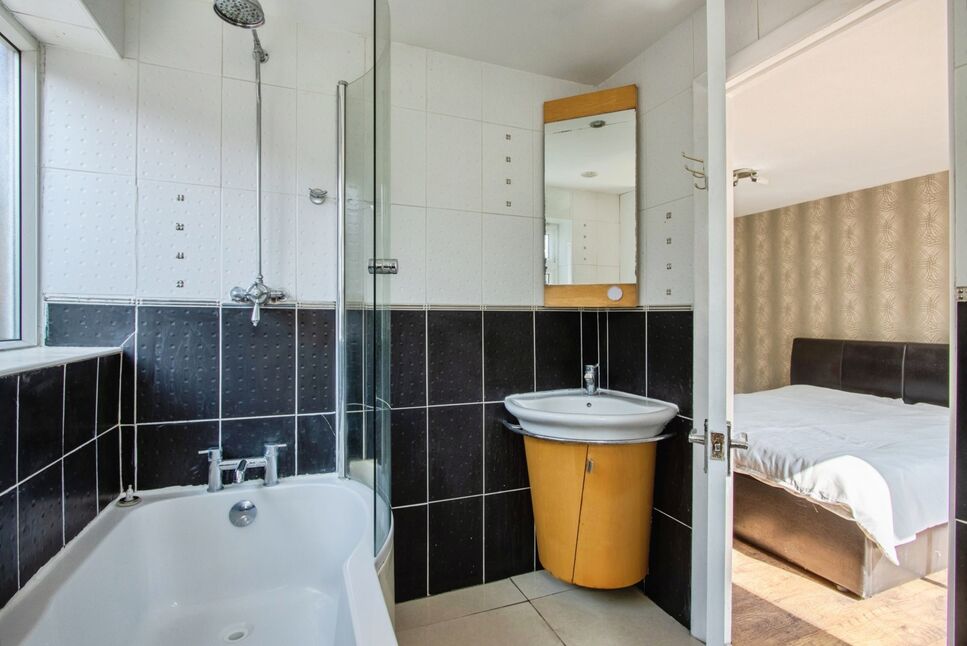 Comprising a panelled bath with shower over, vanity wash hand basin and low-level WC. Finished with wall tiling, a heated towel rail, and windows to both the rear and side aspects. Gas boiler/water heater.