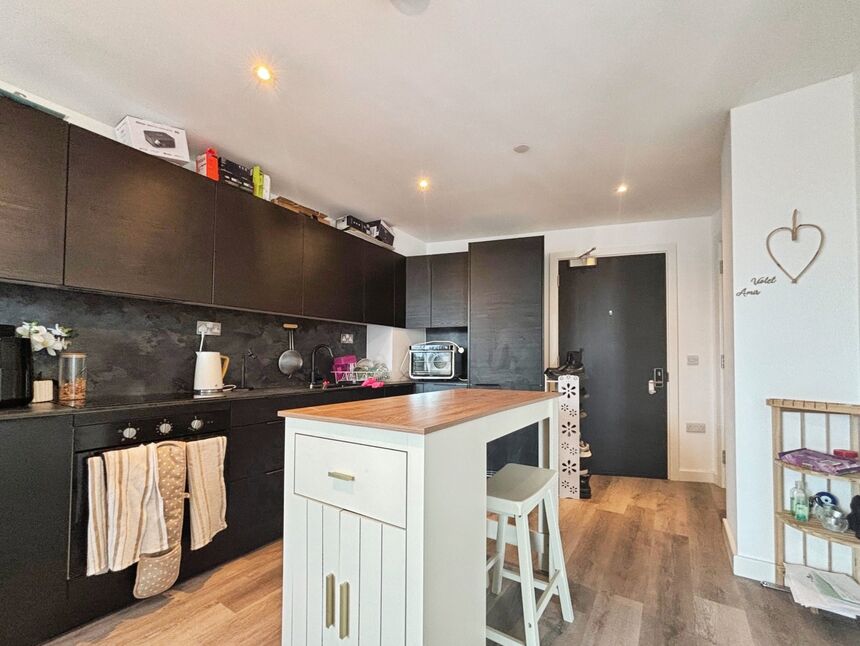 Modern fitted wall and base units with contrasting work surfaces incorporating single bowl sink, electric oven and hob. Integrated fridge freezer. Space for a washing machine in the storage cupboard. Space for a freestanding island providing additional storage space. Open into the sitting area. Doors with views over looking Preston City Centre. Ceiling light point and electric wall mounted heater.