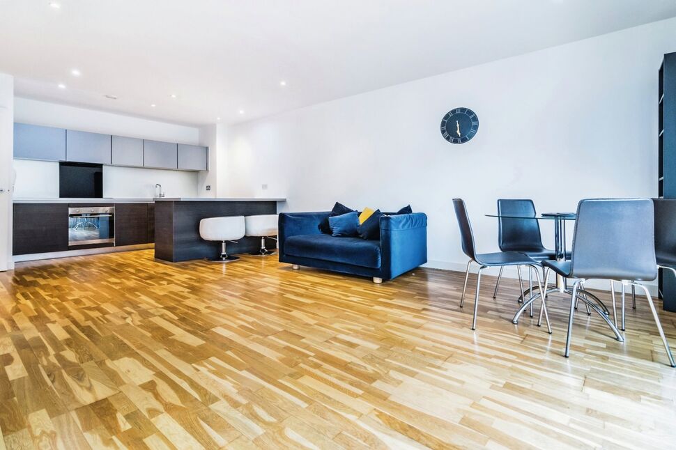 Double doors opening onto a Juliet-style balcony, wooden-style flooring, electric heating. Open-plan kitchen with a range of fitted base and wall units, integral electric oven and hob with extractor hood, integral dishwasher, fridge and freezer. Breakfast bar.