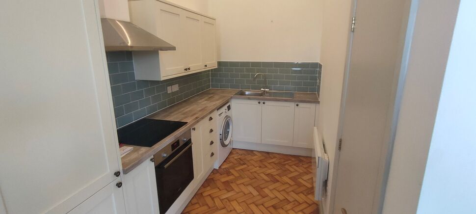 Modern Howden's kitchen base and wall mounted units. Integrated Bosch fridge and freezer, electric oven and four ring ceramic hob under stainless steel illuminating extractor hood. Stainless steel single sink, drainer and mixer tap. Built in Bosch washing machine Built in storage cupboard with hot water tank and electric fuse box. Wall mounted electric radiator and timer switch. Inset ceiling spotlighting and water sprinkler.