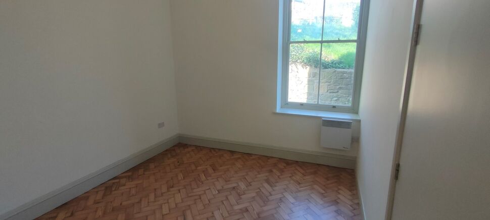 Sash window looking out over Welsh hillside. Wall mounted electric radiator. Ceiling light point. Smoke detector and water sprinkler.