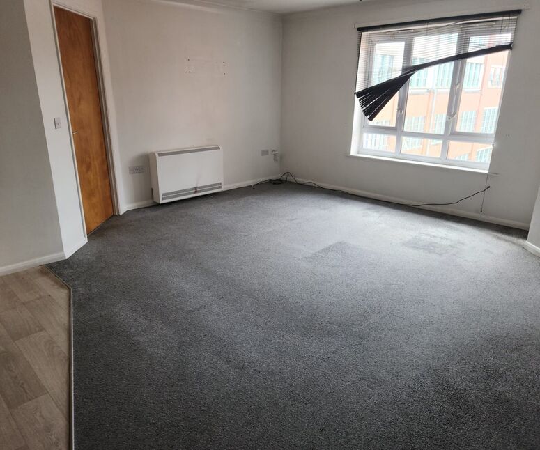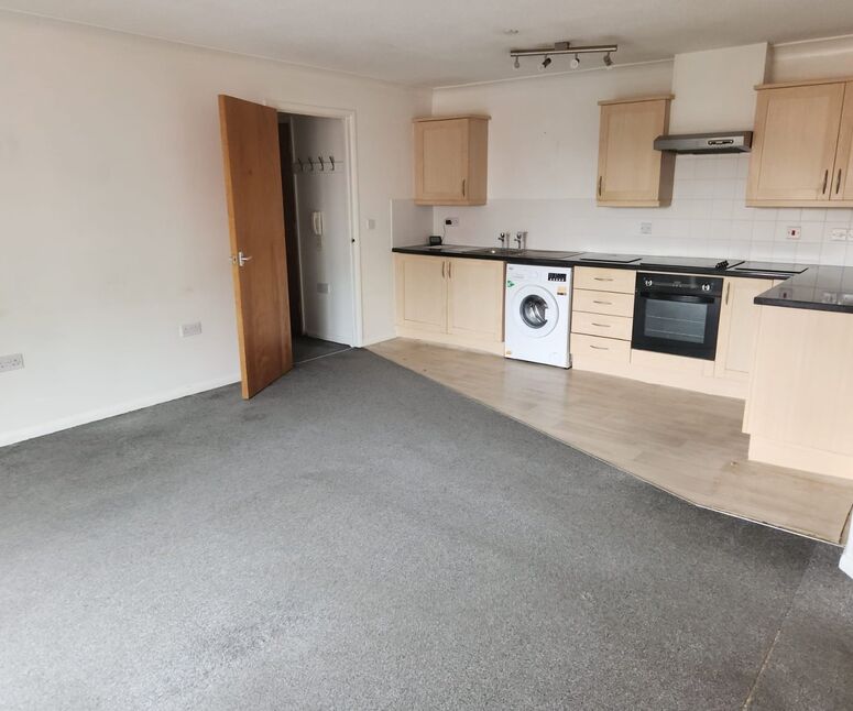 Open-Plan Kitchen/Lounge 5.8x4 The kitchen includes both wall and base units with an inset sink, an electric hob and oven, and a washing machine point. The lounge area features a double-glazed window to the front and an electric heater.