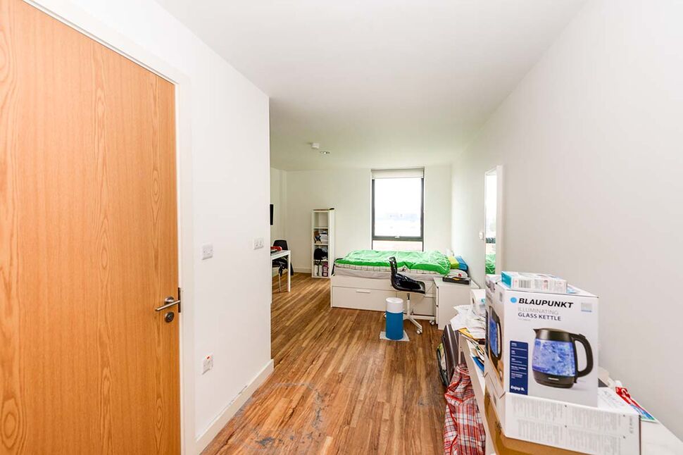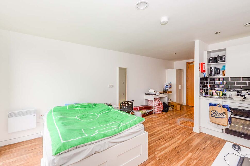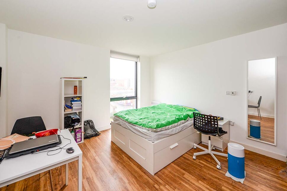 The fifth floor studio apartment comes with views looking back into the city of Liverpool, kitchen area and good sized living/sleeping space as well as a separate bathroom with shower, toilet and wash basin.
