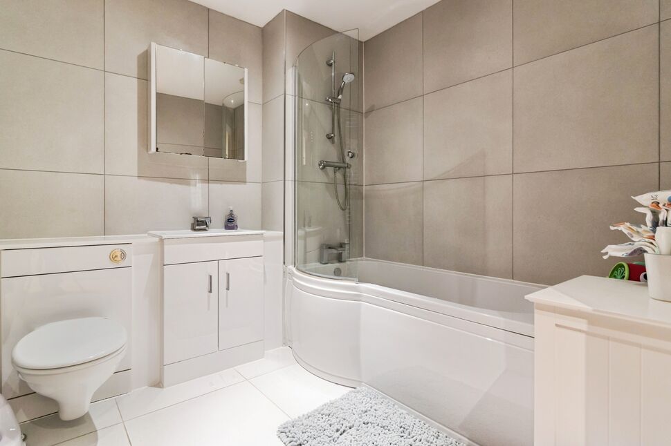 Refitted in a contemporary style consisting of panelled bath with shower over, wash basin with mixer tap and storage below, WC, tiled splashbacks and flooring, heated towel rail.