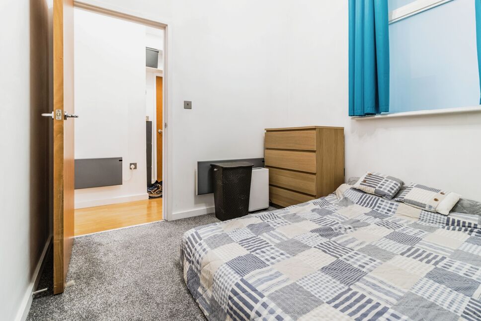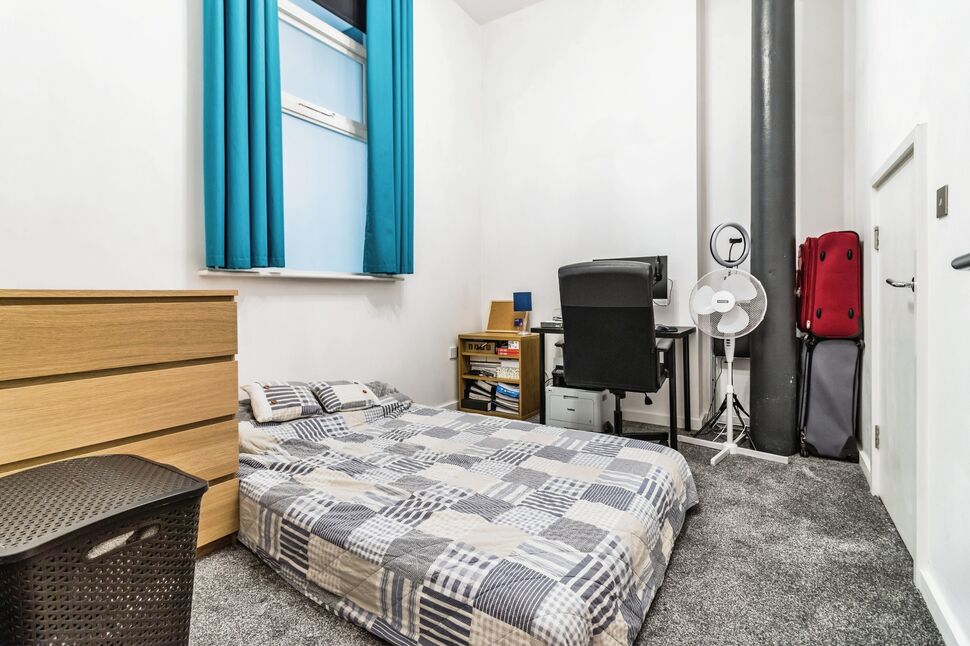 A second generous double bedroom with a frosted internal window, electric heater, carpeted floor and original feature column.