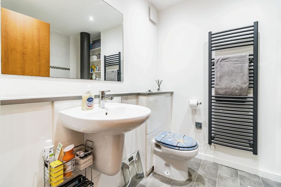 Panelled bath with shower above, wash basin with mixer tap, WC, shaver point, tiled splashbacks, heated towel rail, recessed spotlights, recessed shelving, original feature column.