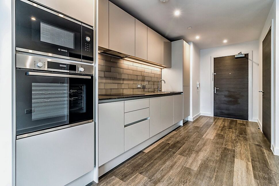 Open-plan layout with cupboard housing space for washing machine. Wood effect flooring, 2 full height windows and electric heater. Kitchen area with fitted base and wall units, sink with mixer tap, worktop lighting, integrated electric oven, microwave, hob with extractor over and fridge/freezer.