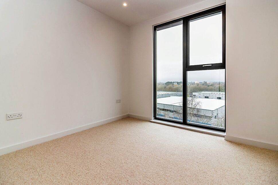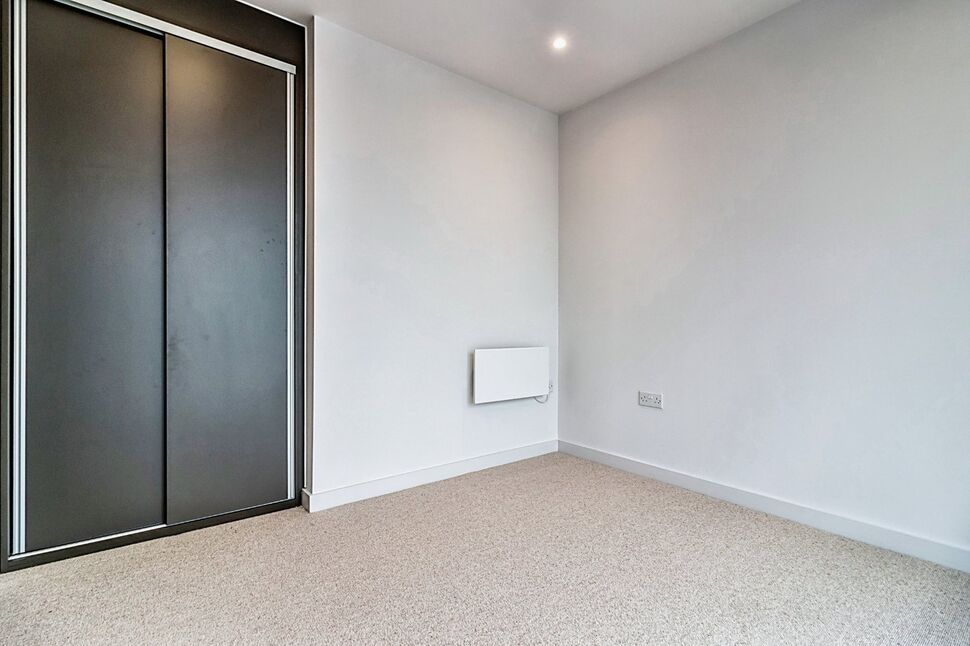 Double bedroom with full height window, electric heater, fitted wardrobe and carpeted floor.